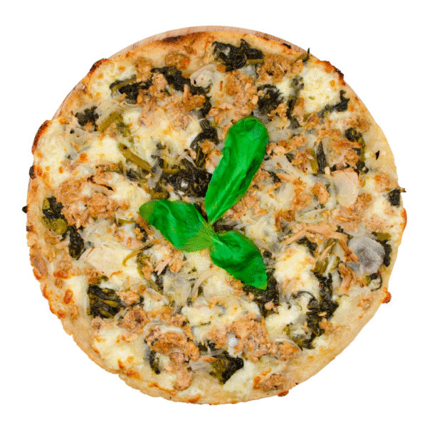 Mozzarella senza lattosio, friarielli spadellati, cipolla spadellata, tonno, basilico fresco