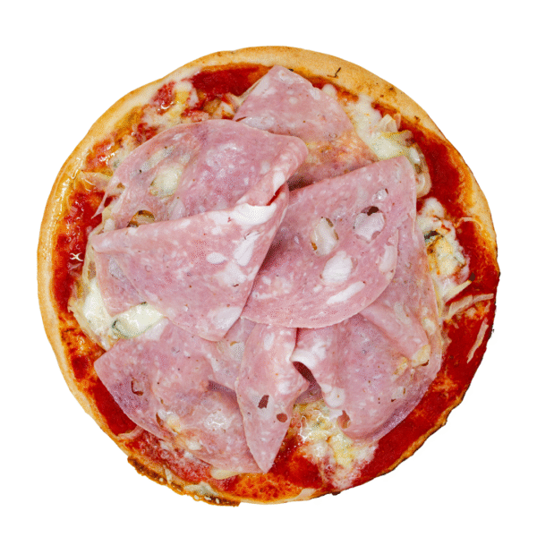 Salsa di pomodoro emiliano, gorgonzola dolce DOP, cipolla bionda spadellata, salame cotto artigianale Piemonte fuori cottura, olio al prezzemolo