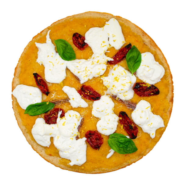 Crema di datterino giallo, pomodori semi dry, acciughe del Mediterraneo, burrata a tocchi, scorza di limone BIO grattugiato, basilico fresco