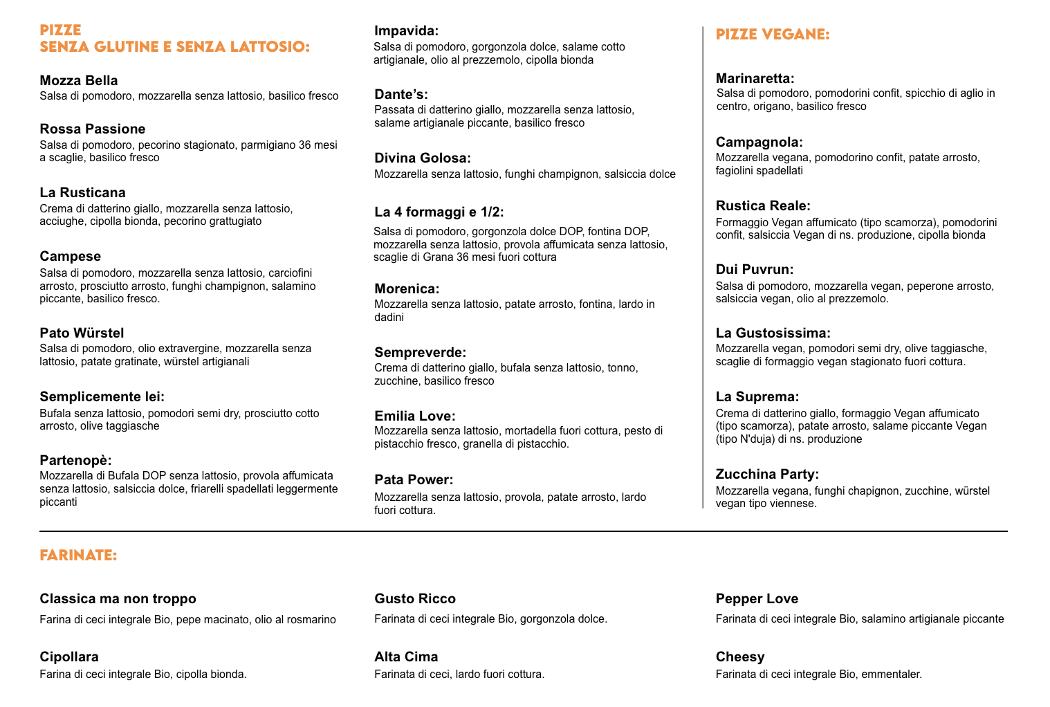 Salsa di pomodoro, gorgonzola dolce DOP, fontina DOP, mozzarella senza lattosio, provola affumicata senza lattosio, scaglie di Grana 36 mesi fuori cottura