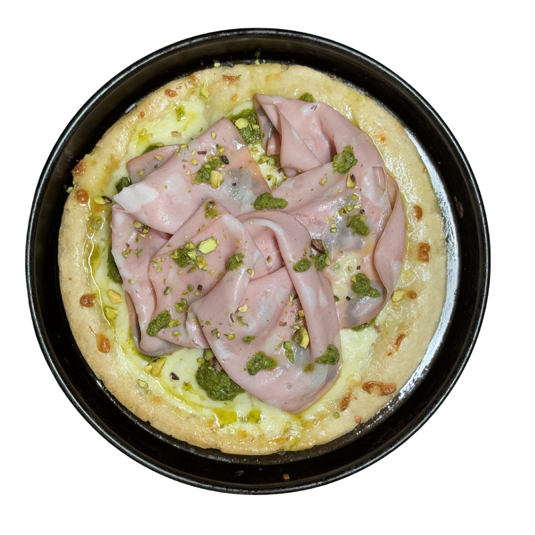 Mozzarella senza lattosio, mortadella fuori cottura, pesto di pistacchio fresco, granella di pistacchio.